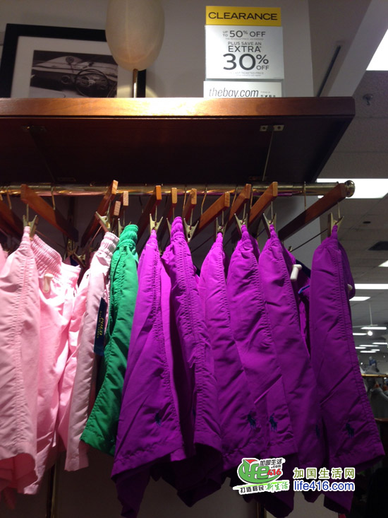 加国生活网小编最新爆料:加拿大BAY商场的各款男士游泳裤正在促销,象POLO的,原价66半价后再七折也就23,其他牌子的象NIKE等也都打折到25。机会难得,不容错过。POLO的就是颜色没有多少选择了,打折的都是小鲜肉的颜色,以粉色、黄色居多。