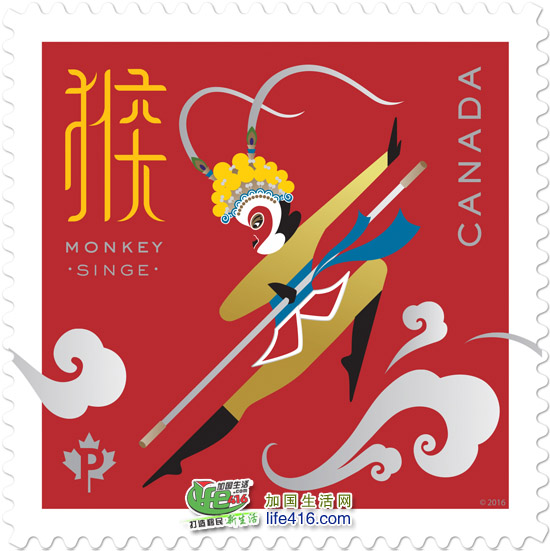 据Canada Post介绍,2016年的猴年生肖邮票仍然是以孙悟空为题材的进行设计的(看下图),设计者是Albert Ng(伍启荣)和Linna Xu,国内邮资(32 mm x 32 mm)的邮票是在红色的背景下,一个充满活力的金猴豁然跃出纸面;国际邮资(40 mm x 140 mm)的邮票则是采用红色和金色相间的京剧脸谱的美猴王形象。2016年发行的猴年邮票,是加拿大邮政局设计并发行的第二轮12生肖邮票中的第8套生肖邮票。