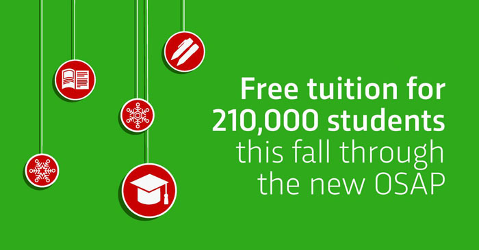 从2017学年开始,安省已开始实施新的大学/学院助学金计划。新的OSAP比以往大为宽厚,超过21万的学生可以获得免学费的补助。每个家庭都可以通过线上计算器具,获知自己可得的助学金额。多年来,学费问题一直阻碍着一些家境贫寒的孩子上大学。省府这一计划,为的是解除低收入家庭的子女接受高等教育的财政困难,让每个有才华年轻人都有机会上大学,开启他们自己的灿烂人生。