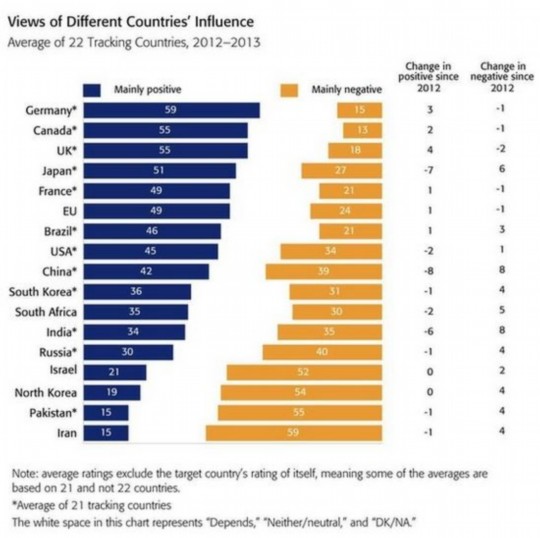 在国家形象排名榜上名列前茅的分别是德国、加拿大、英国、日本、法国和欧盟,美国排名第八,中国排名第九。排名倒数的国家分别是伊朗、巴基斯坦、朝鲜、以色列和俄罗斯。