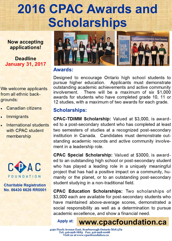 今年的申请的截止日期是2017年1月31日。所有奖学金的申请细节及在线申请表,请浏览CPAC基金会网站www.cpacfoundation.ca,或致电CPAC办公室查询:416-298-7885。