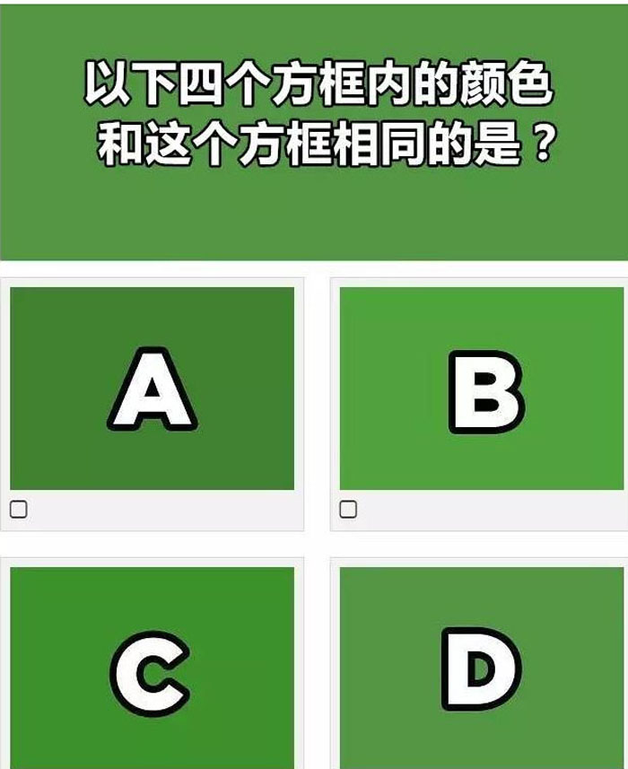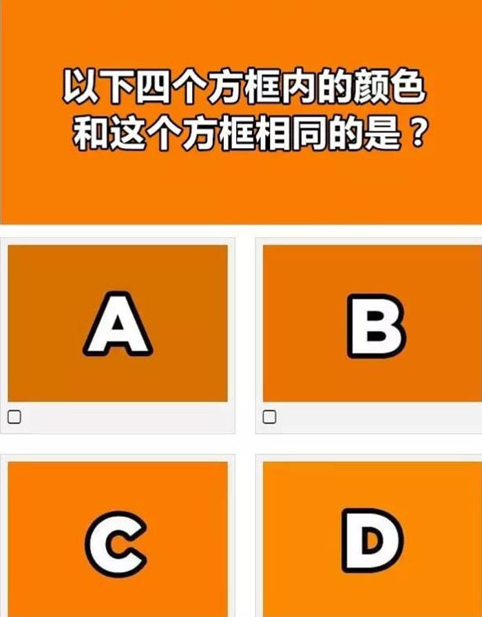 下面这个测试,每题都有四个选项,你要找到颜色匹配的那个。