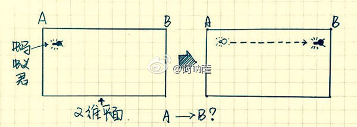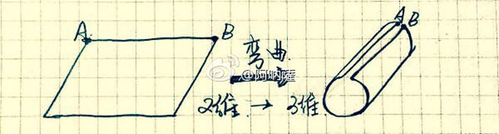 再解释一遍,在这个图示上,蚂蚁从A点消失,B点出现,你们想想,就是这意思,卷曲产生新的维度!