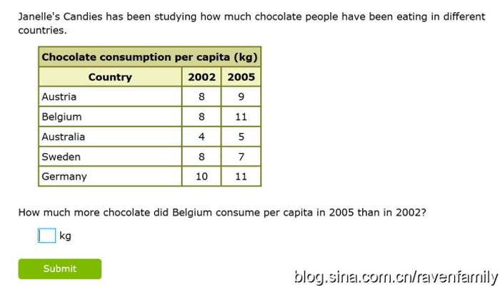 大家知道,美国人喜欢用数字说话,虽说小学学习统计学为时尚早,但四年级数学已经开始引进图表,教会孩子们看懂科学文献中经常出现的各类表格,且看下面这道题,说的是某个糖果公司针对各国巧克力消费人群的市场调查结果,问题是根据下面的图表,2005年比利时人均巧克力的消费量对比2002年增加了多少?