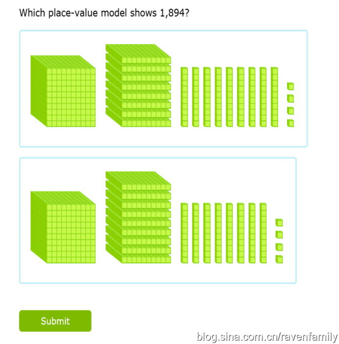 话说贝贝一年级开始,学校就为孩子们购买了一套数学练习软件IXL,不仅在学校使用,也极力推荐家长鼓励孩子们在家里自学。妈妈看过贝贝用过,感觉这套软件以美国中小学教学大纲为基础,鼓励大家多做题,锻炼孩子的数学能力。宝贝妈咪从这套软件来看,感觉美国小学教学更喜欢用图片来解题,不好意思的跟大家说,这是美国孩子的四年级数学题,用图片表达1894这个数字: