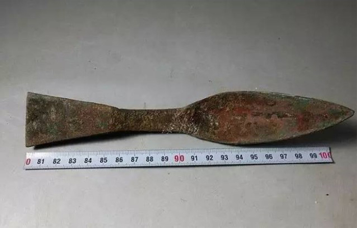 只不过,当时人们把用于餐桌上的刀具叫做“匕”。现代人用的匕首原来产生的时候居然是用于饮食的。看看下面出土的青铜匕,它具有两种实用功能:一是相当于勺子,二是相当于餐刀。可以切可以捞。