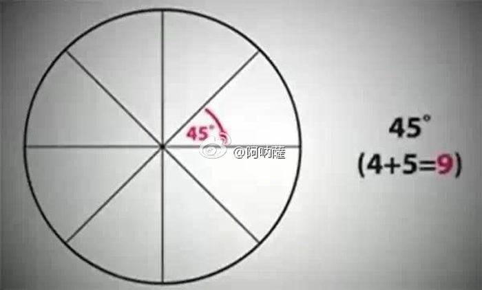 依次等分下去,结果一样。。。。任何被分成等分的角度的所有数字之和为9。