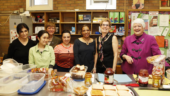 安 省省长韦恩4月8日探访市中心的Ogden Jr. Public School小学,宣布扩大学生营养计划,于340家最有需要的中小学内增加56,000个名额,并与学校的教职员一起为学生准备造参。陪同她一道的有儿 童及青少年服务厅厅长皮茹栅(Teresa Piruzza,左三)和教育厅厅长单杜丝(Lis Sandals,右)。