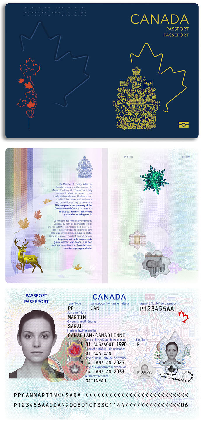 10、加拿大最新版的护照真的很漂亮,这是2023年5月10日最新发行的护照,通过艺术的方式增加了一些新的防伪安全功能,包括:照片的多个版本、封面上有不同颜色的金属箔枫叶、背面的压花枫叶、个人信息页面上的红枫叶(如果您用手指摩擦加热它会消失)、可见芯片和天线、鹿和雪花形状的磁化变色墨水,所有这些都可用于检测欺诈并确认您的护照有效。