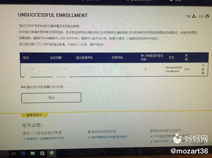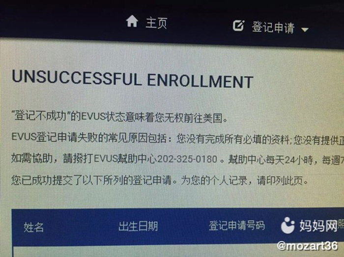 目前EVUS登记不成办应该是会出来两种状态“Unsuccessful Enrollment”和“DOS已撤销您的签证”