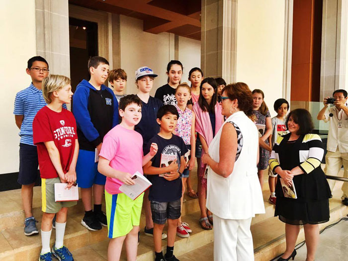 安省旅游、文化及体育厅厅长麦玛康在安省艺术馆馆外向一班学童讲解省府推行的首个“文化战略”