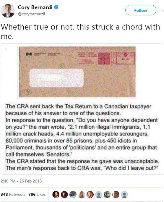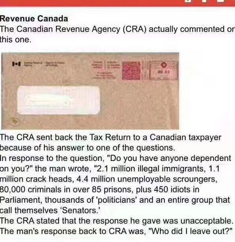 又到加拿大的报税季节,最近,一个段子在网上疯传。