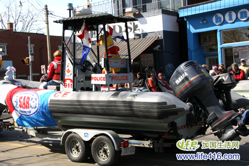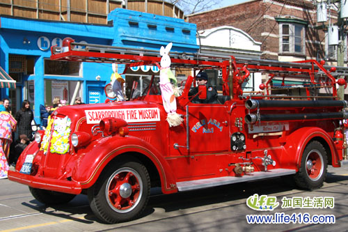 多伦多消防局也派出了消防局里的各种消防车辆,红艳艳地从大家面前经过。帅帅的消防员叔叔向人群挥手致意。