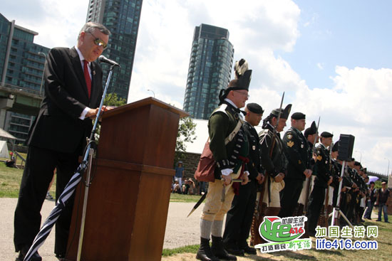 David C. Onley 致辞说,Fort York 是多伦多的出生地,在这里举行的Simcoe Day 庆祝活动特别具有历史意义。他向1793年约克镇的建立者,也是安省第一位省督John Graves Simcoe 致敬。