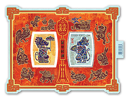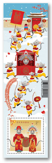 鼠年邮票仍由去年猪年生肖邮票设计师来自Albert Ng and Associates的伍启荣(安省勋章获得者)及白升宰共同设计,以“中国农民画”这一民间艺术形式,描绘了传统故事《老鼠嫁女》。Permanent™国内邮票描画了新娘坐轿去成亲的热闹场面,而国际邮票则展现了一对幸福满溢的新婚夫妇。