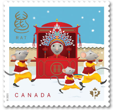 2020年发行的鼠年邮票,是加拿大邮局设计并发行的第二轮生肖邮票中的第12套生肖邮票,也是第二轮生肖邮票的最后一套邮票