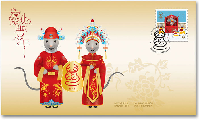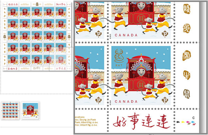 鼠年邮票仍由去年猪年生肖邮票设计师来自Albert Ng and Associates的伍启荣(安省勋章获得者)及白升宰共同设计,以“中国农民画”这一民间艺术形式,描绘了传统故事《老鼠嫁女》。Permanent™国内邮票描画了新娘坐轿去成亲的热闹场面,而国际邮票则展现了一对幸福满溢的新婚夫妇。