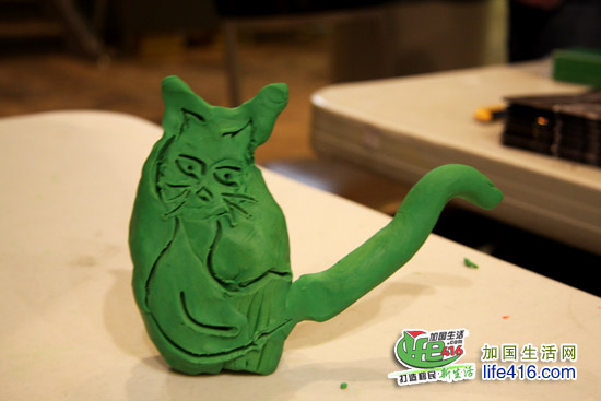 这是小编的“作品”,做的太恶心了,哈哈,五分钟内实在弄不出什么,而且这个泥巴特别特别硬,捏不动啊。之所以弄成一只猫,小编认为:在五行中绿色代表的是木,所对应的动物就是虎和猫,小编又最爱猫,所以就是它了。