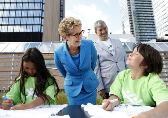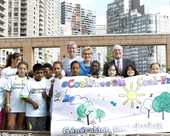 省长韦恩7月7日前往市中心的青年会,宣布省府即将重新提出立法,永久禁止使用燃煤在省内发电。在作出宣布后,她与一些小学在场的小学生分享他们的环保意识创作。旁为环保及气候变化厅厅长简万里(Glen Murray)。