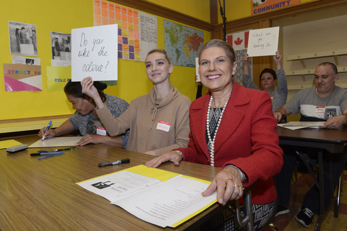 安省公民移民厅厅长罗鬓妮(Laura Albanese)在伊陶碧谷(Etobicoke)的Mimico Adult Centre作出拨款的宣布后,与一些接受英语训练的学生一起上课。