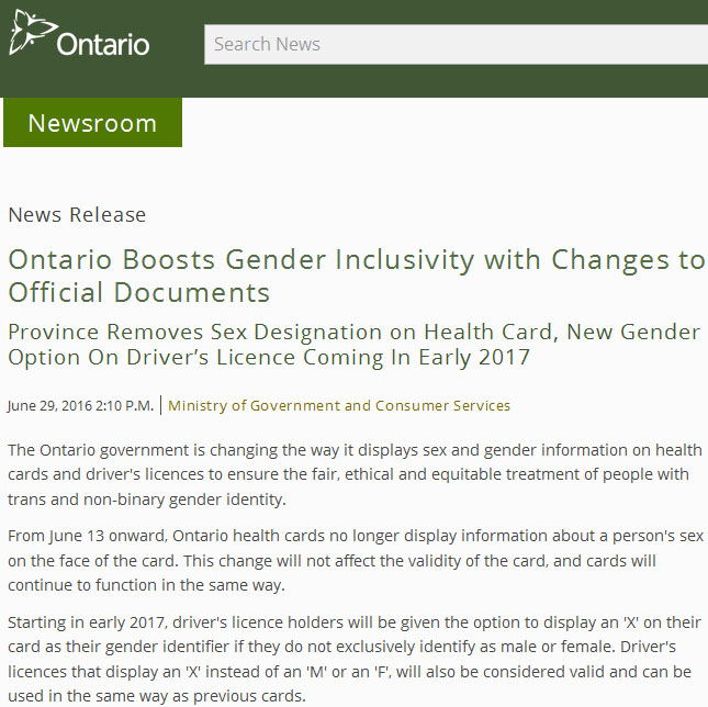 安省交通厅厅厅长邓德华(Steven Del Duca)说:“我们的政府重视接受、尊重及多元化,并承担责任去确保所有省人都得到同等、合理而公平的对待。正是这个原因,我们将于2017年初起,在新发出的驾照上,性别一栏将可显示‘M’、‘F’及‘X’。”