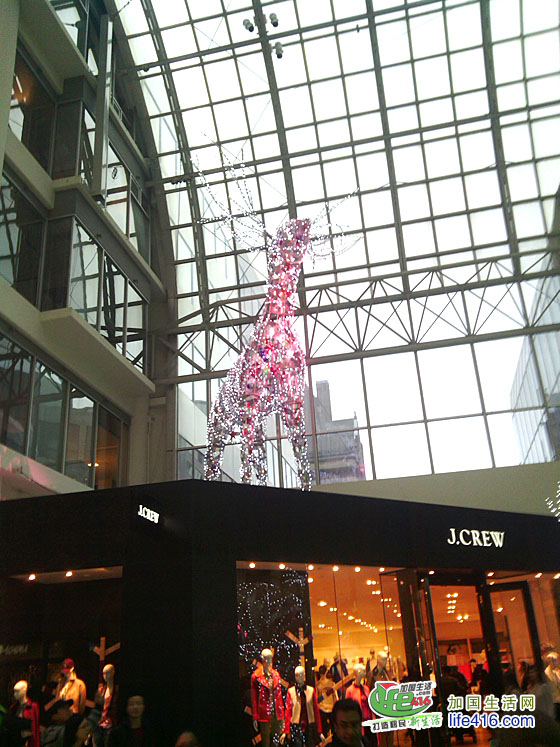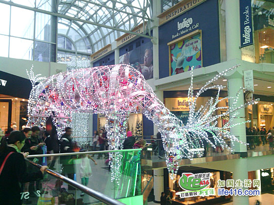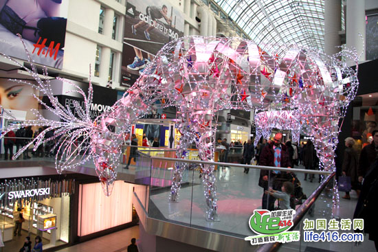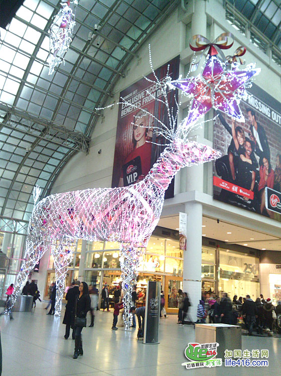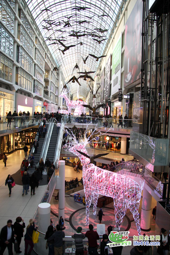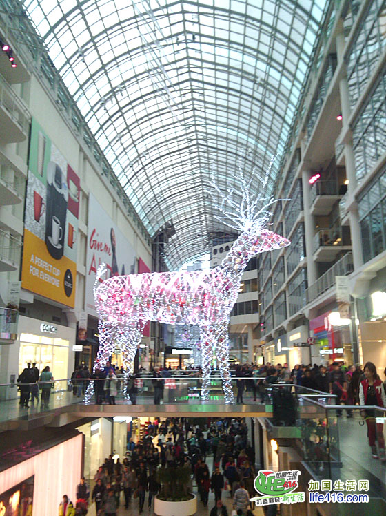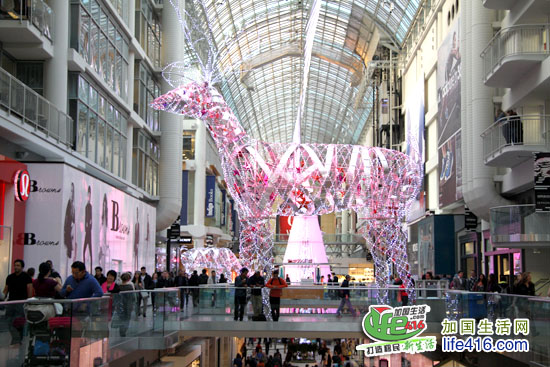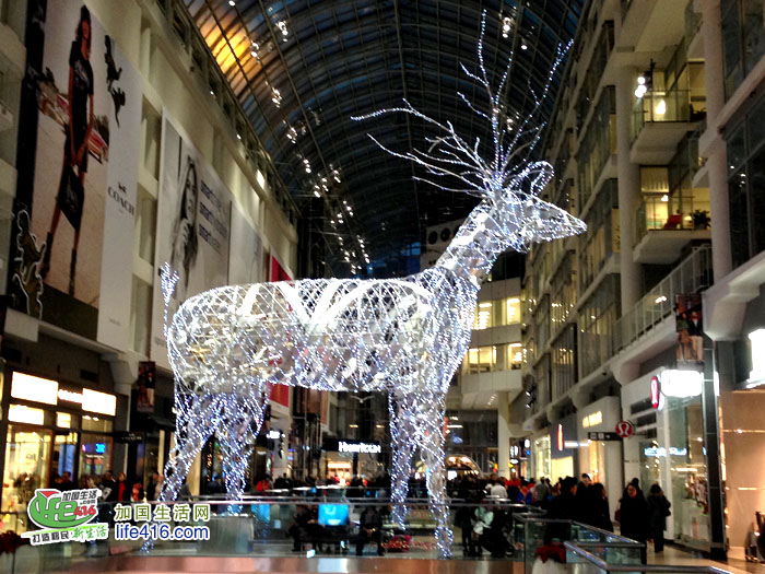 【加国生活网专稿】Toronto Eaton Center 是多伦多最著名的购物中心和旅游景点,每年的圣诞季,这里都会装饰得特别漂亮。2012年的圣诞节,Eaton Center 增加了全新的圣诞彩灯—极具加拿大特色的麋鹿彩灯。
