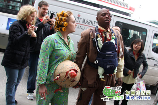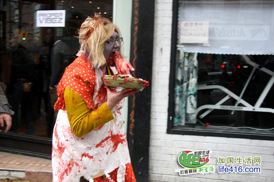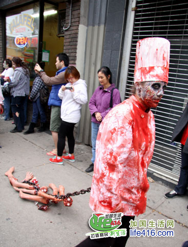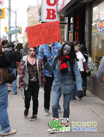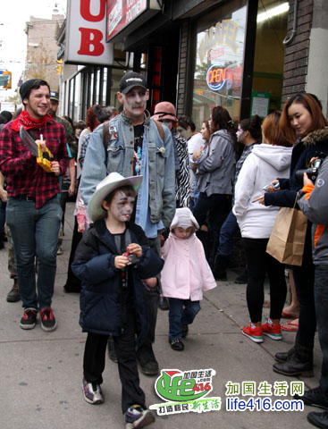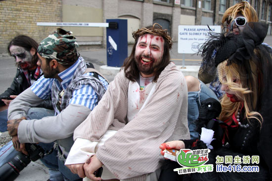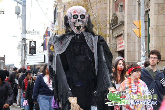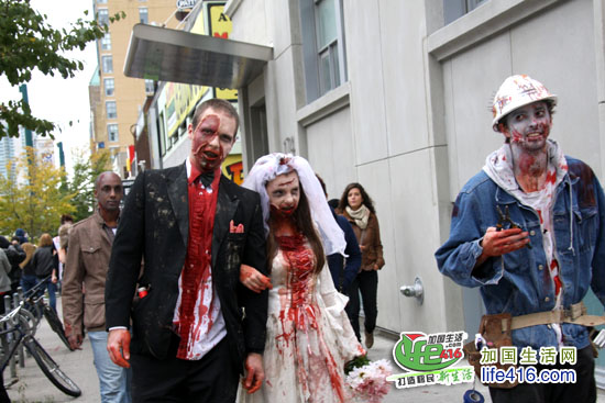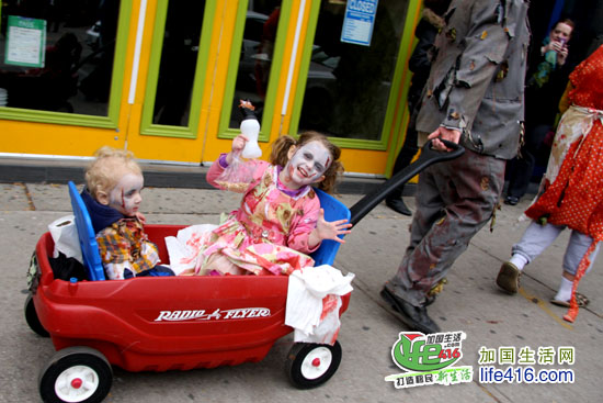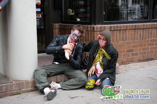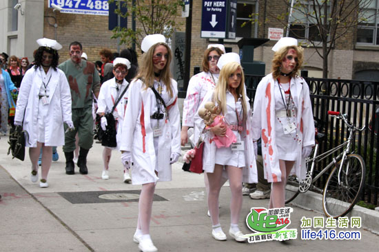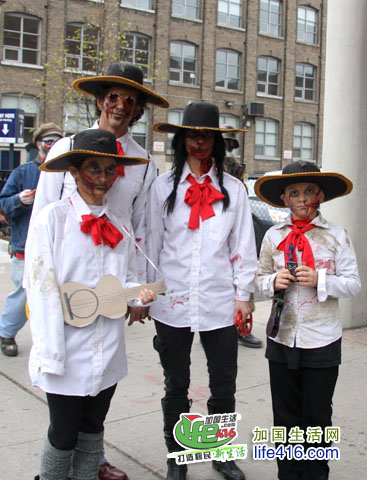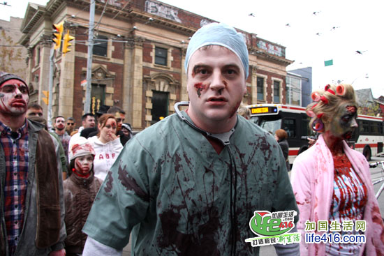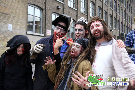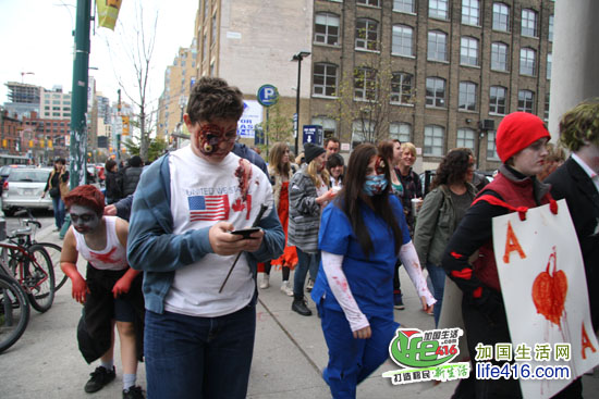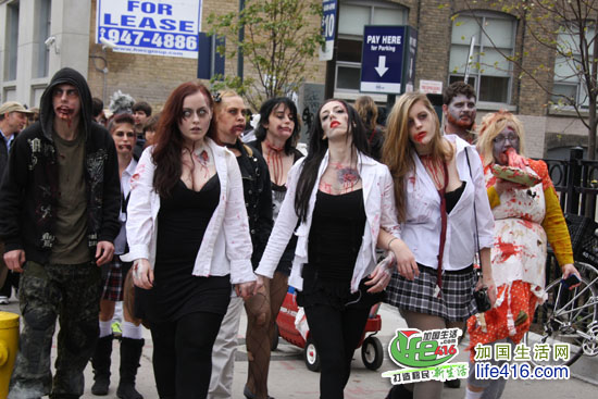 【加国生活网专稿】每年的万圣节前一个星期,Toronto Zombie Walk 多伦多僵尸大游行都会在多伦多市中心的街头隆重上演。僵尸大游行可以说是加拿大人自己化好妆自己在大街上表演的最好的舞台,大家比的是创意,玩的是幽默和气氛,乐在其中,甚至全家参与。