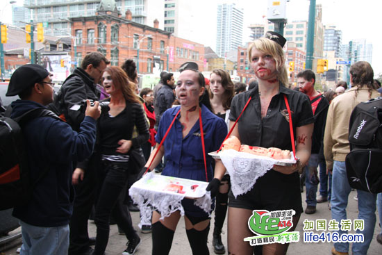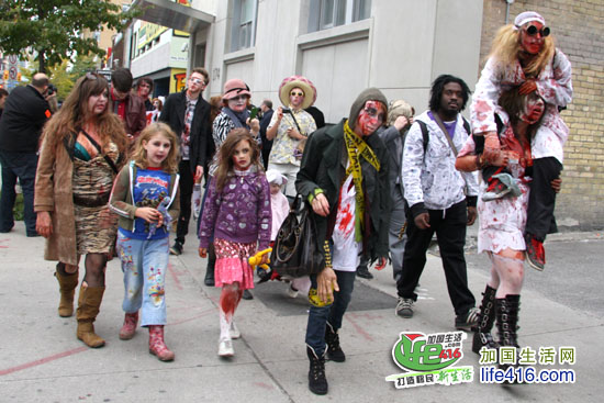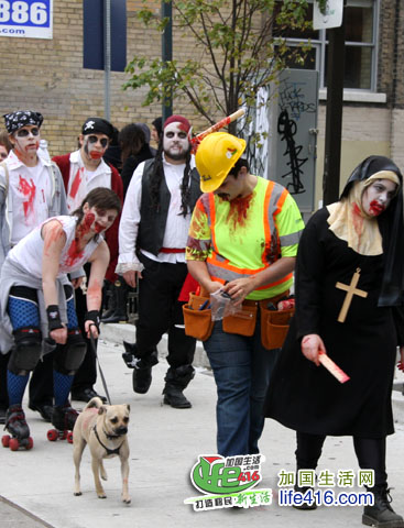 僵尸游行中还有一批僵尸狗狗呢,也被主人装扮出来参加游行。