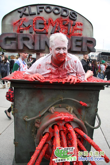 小编近距离拍了一张Zombie Grinder 照片,这位老兄的创意很大胆也很有新意。小编在这里先给大家“剧透”一下,这位僵尸大叔成功荣获了2012年度多伦多僵尸大游行的最佳化妆服装奖的第一名。