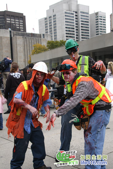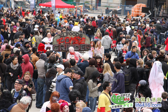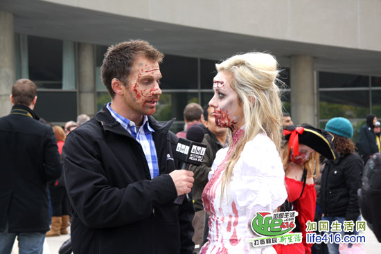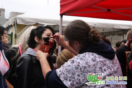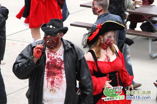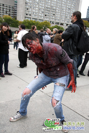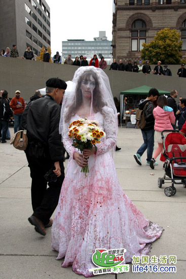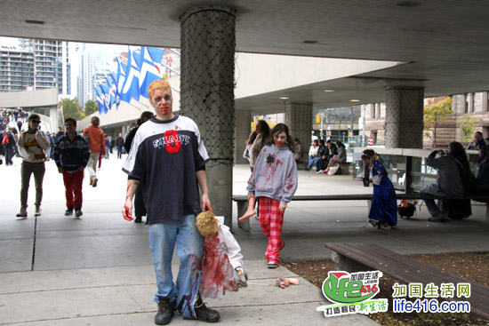 【加国生活网专稿】2012年10月20日星期六,第十届Toronto Zombie Walk 多伦多僵尸大游行在多伦多市政府门前广场Nathan Phillips Square举行。由于今年的活动有Heart and Stroke Foundation 赞助,活动内容与游行路线都与往年有所不同:12pm-2:30pm 僵尸们先在广场碰头,先听听音乐、看看展览;2:30pm 是Toronto Zombie Walk 多伦多僵尸大游行开幕式以及公布僵尸妆评比结果;3pm 僵尸大游行开始,基本上是绕着市政府转圈,呃……;游行完之后就是盛大的现场音乐会,由来自Montreal 的The Brains 乐队演出。