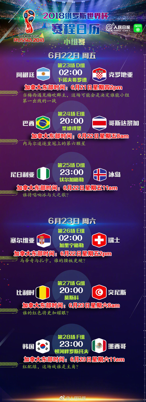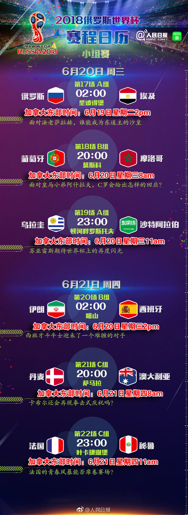 2018年俄罗斯世界杯拉开战幕 官方完整赛程表(加拿大东部时间) - 小组赛(6月19日至6月23日)