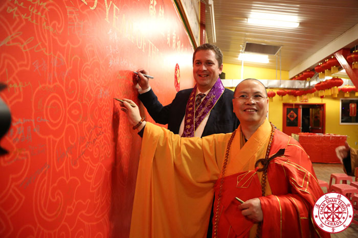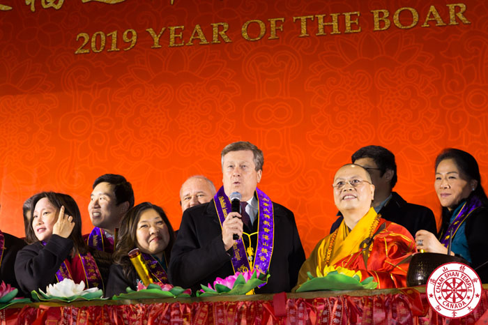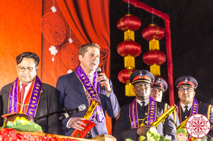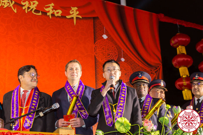 湛山普贤殿内嘉宾如云,当晚有:加拿大联邦小企业与出口促进部部长伍凤仪( Mary Ng)女士,联邦国会议员谢尔(Andrew Scheer ,保守党党魁)、谭耕、叶佳丽 (Jean Yip)、陈圣源(Shaun Chen)和马万里(Majid Jowhari)先后来到,与大家互道祝福,合影留念。中华人民共和国驻多伦多总领事杨葆华、宋晨亮二位领事也来到这里,一起点智慧灯、写许愿牌和许愿带。多伦多市长庄德利( John Tory )、万锦市市长薛家平(Frank Scarpitti)和安省议员何文彬(Vincent Ke)、白必勤(Aris Babikien)等三十多位三级政要亲临祈福大典,共同为世界和平和加拿大的繁荣昌盛、百姓安居乐业祈福,并送上新年祝福。加拿大和中国两国政要与当地社会名流、各族信众见证了这辞旧迎新的难忘时刻。