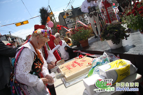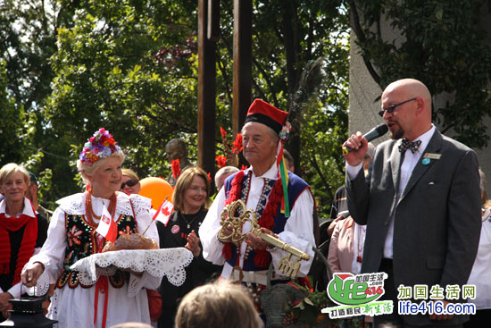在Roncesvalles Village Polish Festival 多伦多波兰节的主会场上,大会主持人交给这位长寿老人一把金钥匙,代表此次波兰节正式开始(注意老人旁边的老奶奶手捧着的面包,这个面包会被传到台下让观众品尝)。