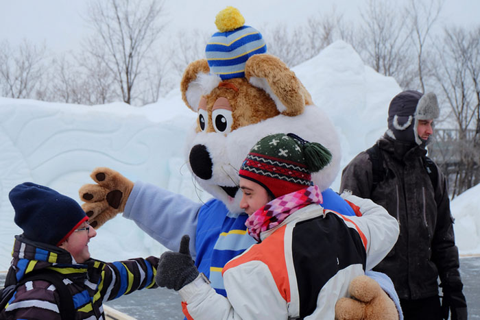 但我最喜欢雅克-卡地亚公园。这里的冰雪王国里不仅可以滑冰梯,玩狗拉雪橇,还有着冰雪嘉年华上最可爱的吉祥物:冰鼠。冰鼠爸爸带着冰鼠妈妈,还有双胞胎的儿女会不时出现在公园内,和人拥抱,拍照合影。