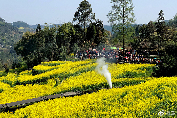 成都人春天的手机上,总会被一辆旧式窄轨小火车霸屏着。从金色花海中穿行的古老蒸汽火车,美得就像动漫里的场景。这一列开往春天的火车,引发了不少摄影师和游客的追捧。这就是乐山犍(qian)为的嘉阳小火车。哈哈,可能很多人对那个犍字都会头痛半天怎么读,犍为郡可是从汉代就雄霸西南的一个边郡,是南方丝绸之路上重要的一站。但今天我们不聊犍为郡,只说说这个世界上最后一列客运蒸汽小火车。