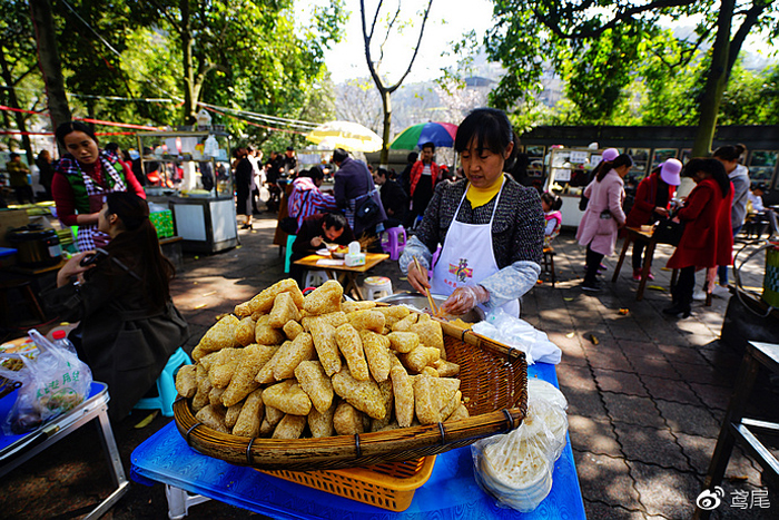 三井车站前好多人摆摊,从乐山名小吃钵钵鸡、咔咔儿(豆腐干夹萝卜丝、花生碎蘸糖醋辣椒油)到鲜榨的甘蔗汁都有。还有卖新鲜的野菜的,椿芽、鱼腥草都有。
