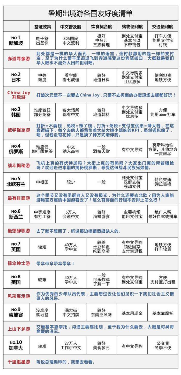 网友自制的暑期出境游各国友好度清单 加拿大入围了 美食多总理帅是原因