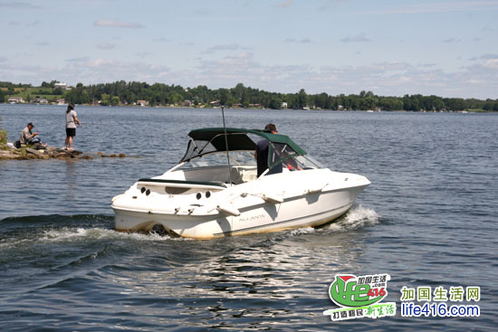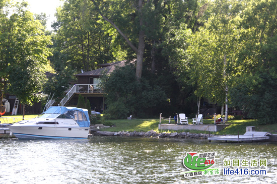 在等待鱼上钩的时候,顺便欣赏欣赏湖边的风景。住在湖边的加拿大人的生活都是这样的,有一幢房子,房子后院是草坪、码头、游艇、Deck。傍晚的时候,坐在Deck 上,喝着啤酒,钓着鱼,欣赏着湖边夕阳西下的美景……