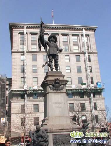 在圣母教堂对面有个军人广场,广场虽然很小,但到圣母大教堂一定会经过这个广场。广场上有个军人雕像,这个军人雕像就是蒙特利尔市的首任市长Paul Chomedey de Maisonneuve(就是我们前面所介绍的那个背十字架上皇家山以感谢圣母的那位市长(见《加东三日游记-蒙特利尔篇(上)》)。相传1644年Paul市长在这里杀死了当地土著易洛魁人的首领,从此终止了印第安人的攻击。围绕在其脚下的是四尊塑像,分别是为蒙特利尔做出贡献的三个代表人物(军人、医生、皮毛商人)和当时的战斗对手印第安酋长。