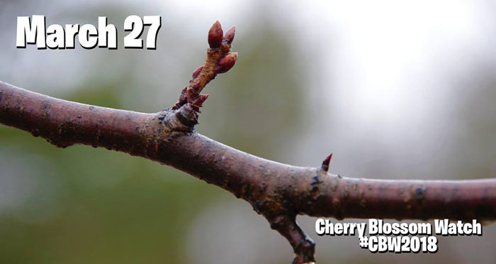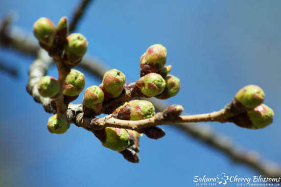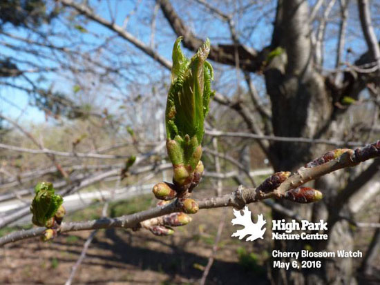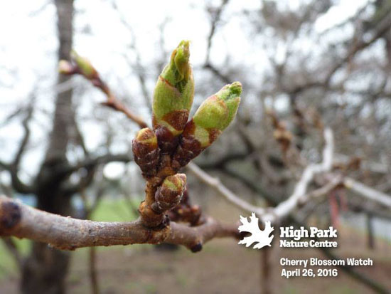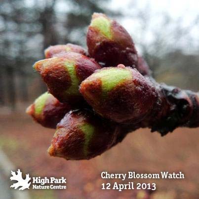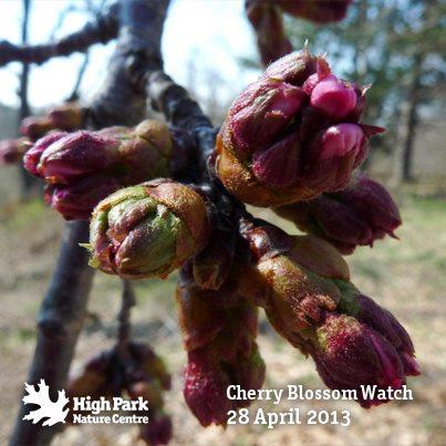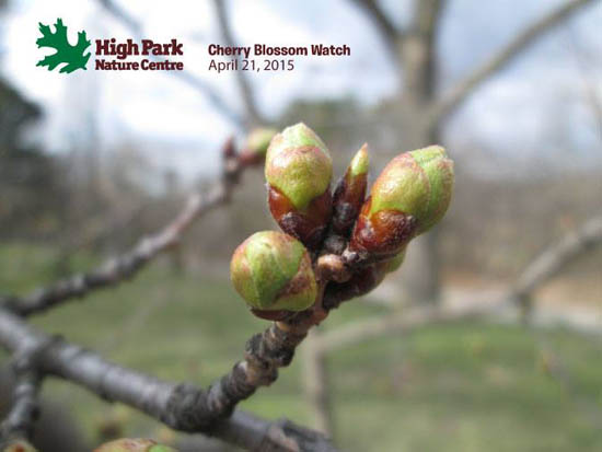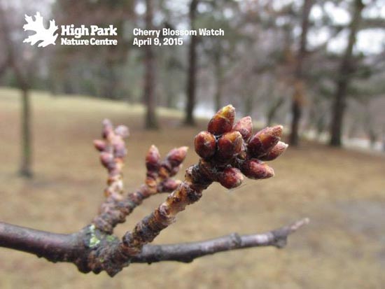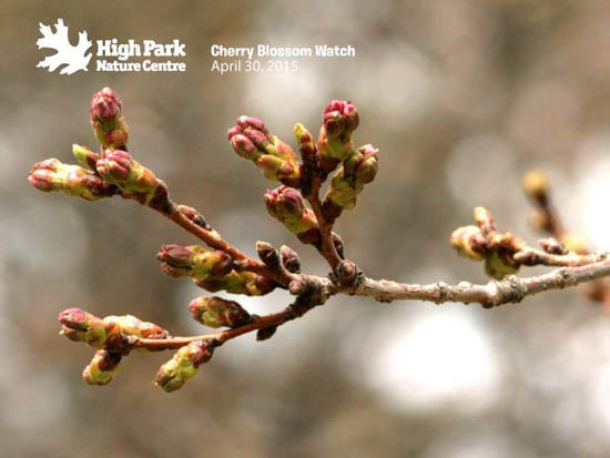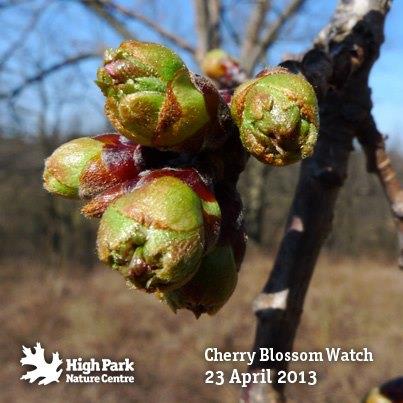 2013年4月15日:据多伦多High Park 公园官方Facebook 所展示的樱花照片显示,由于这几天多伦多的气温回升,现在的樱花骨朵正在茁壮成长。虽然他们也很难预计樱花具体在哪天才能盛开,但根据以往的经验,从这种骨朵状态到开花大致需要二周左右的时间。这还是在这二周气温渐渐升高的情况下做出的估计,如果再下场雪的话,樱花盛开的时间还要再继续推迟的。