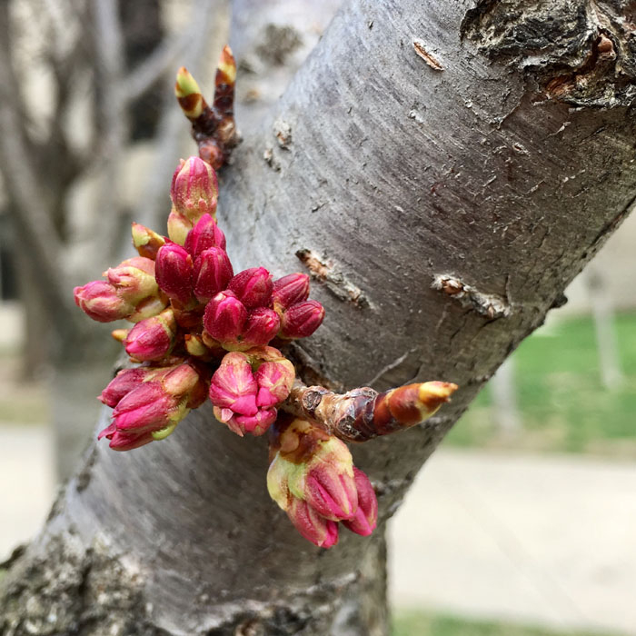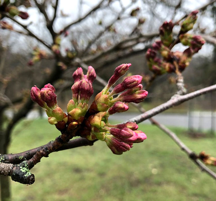 2022年4月22日:截至4月20日,多伦多High Park公园的樱花已经在树枝上长出肥大、圆形的绿色花蕾——这表明樱花正处于开花发育的第一阶段。未来几天更温暖、更阳光明媚的天气将有助于樱花开花。当能看到更多的小花骨朵时,说明樱花将达到开花发展过程中达到第2阶段,到那时才能更好地估计何时会出现开花高峰。