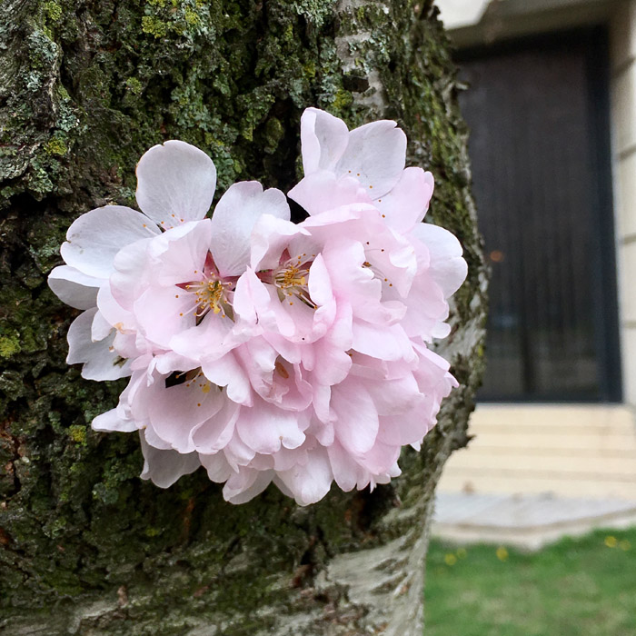 而多伦多大学校园里的樱花是这样的,几乎与high park公园的樱花同步(感谢妃妈viv提供的照片):