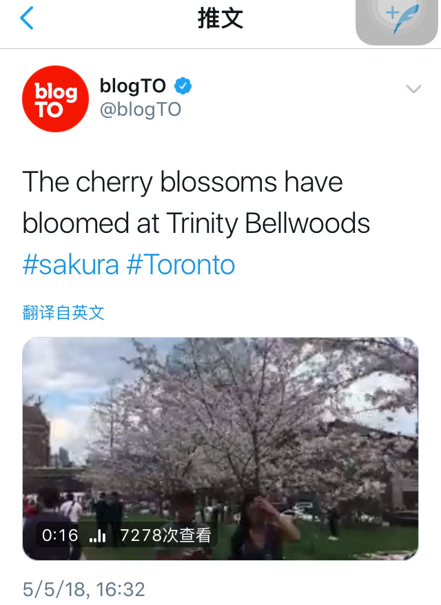 另外,感谢加国生活网热心网友妃妈viv拍摄的多伦多大学最新樱花照片,那里的樱花已经处于盛开状态了。多伦多大学处于多伦多的南边,气温要比处于多伦多西边的High Park公园相对更高一点,每年也都是那里的樱花最先开放。其实,加国生活网小编在4月初的报道中曾介绍过,多伦多全市有15处樱花盛开的景点供市民观赏,详情请点击这里查询,大家不用专门拘泥于High Park公园一处赏樱,这个周末如果天气好的话,大家查好赏樱地址,开启赏樱之旅吧!!友情提示:大家在户外赏樱时,一旦周围人太多,请务必戴好口罩。