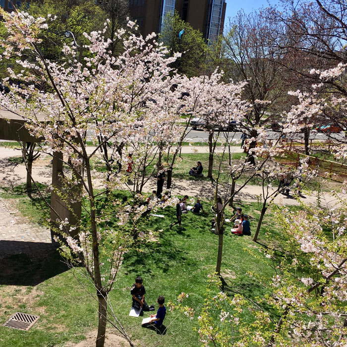 这是5月5日多伦多市中心(Downtown)位于Queen街的Trinity Bellwoods公园的樱花的样子,已经有无数市民出门赏花了: