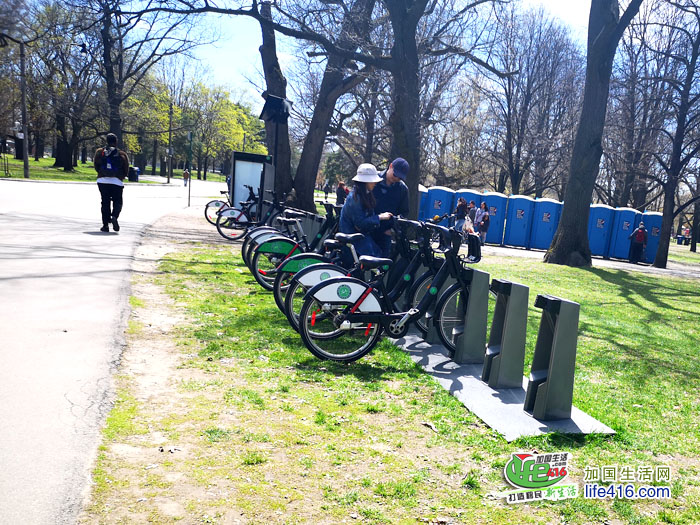 倒是公园里还允许骑自行车,公园里有租用自行车的地方叫Bike Share Toronto,类似国内的共享单车。租自行车的地方就在公园入口的不远处,旁边还有一排简易公共厕所,方便了下了地铁后内急的人,可以说公园的各项考虑都很贴心。