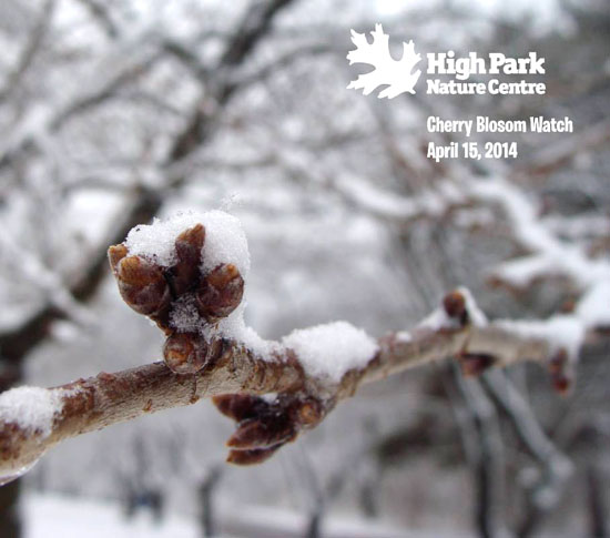 2014年4月15日:前几天多伦多气温已经达到了20多度,High Park的樱花正趁着温暖的空气努力冒出绿花苞呢,结果周二一场大雪,让一些已经冒出花苞的樱花们受到不小的打击。High Park 的官方facebook 称,好在冒出绿花苞的不是很多,大部分樱花骨朵仍有坚硬的外壳保护着,所以看起来樱花们没受多少影响,它们正等待着温暖空气的重新降临。