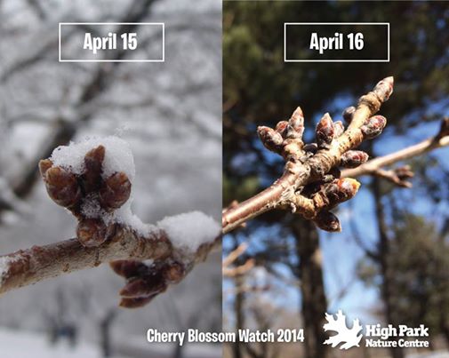 2014年4月10日,多伦多这几天的气温都在零度以上,有几天甚至到了10度以上,不过风挺大的。High Park 的樱花目前已经冒出芽,有些已经形成花骨朵的雏形了。据High Park 的官方报道称,去年的樱花怒放时间是4月30日至5月3日,今年估计也会在这段时间前后。大家拭目以待吧,哈哈。