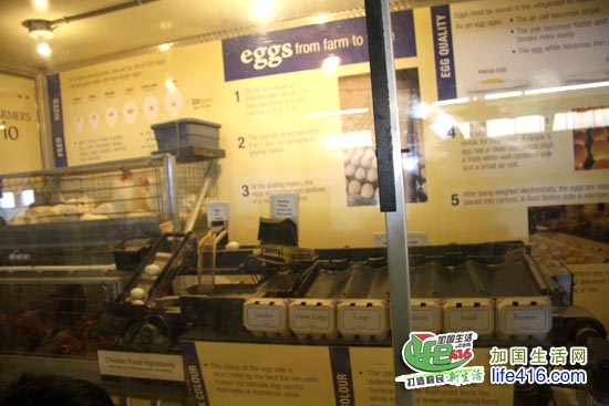 看到这个展示,小编终于了解到咱们在超市里买到的各种大小的鸡蛋是如何生产出来的了。在养鸡农场里,母鸡们下完蛋,所有的蛋都会通过这样的流水线进行分拣,分别进入到从small 到Large 的各种流水线,再装盒进入市场销售。