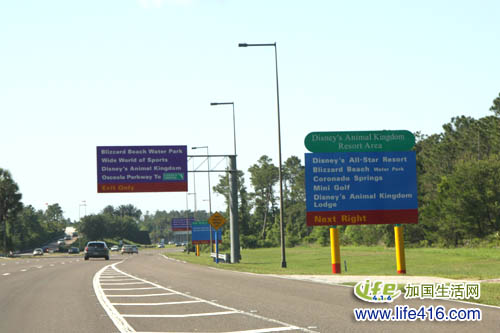迪斯尼的四个主题公园都需要从4号高速公路的65号口下,当从65号口进入Epcot Center Dr.的时候,路牌一下子充满了“童话”色彩。老公一边开车一边还说,看看人家把这路牌弄的,多有情调……结果两个人光顾着看漂亮的路牌了,开着开着就迷了路。