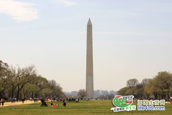 从美国国会大厦到华盛顿纪念碑,这一片区域有大片的绿草地和一幢幢博物馆。路边有些樱花树正在盛开。